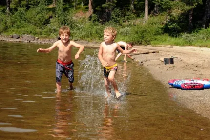 Visa kartanInnan norska gränsen finns en rastplats och därifrån kan man lätt ta sig till badplatsen. Det är en liten strand med omklädningsrum samt bänkar för fika.