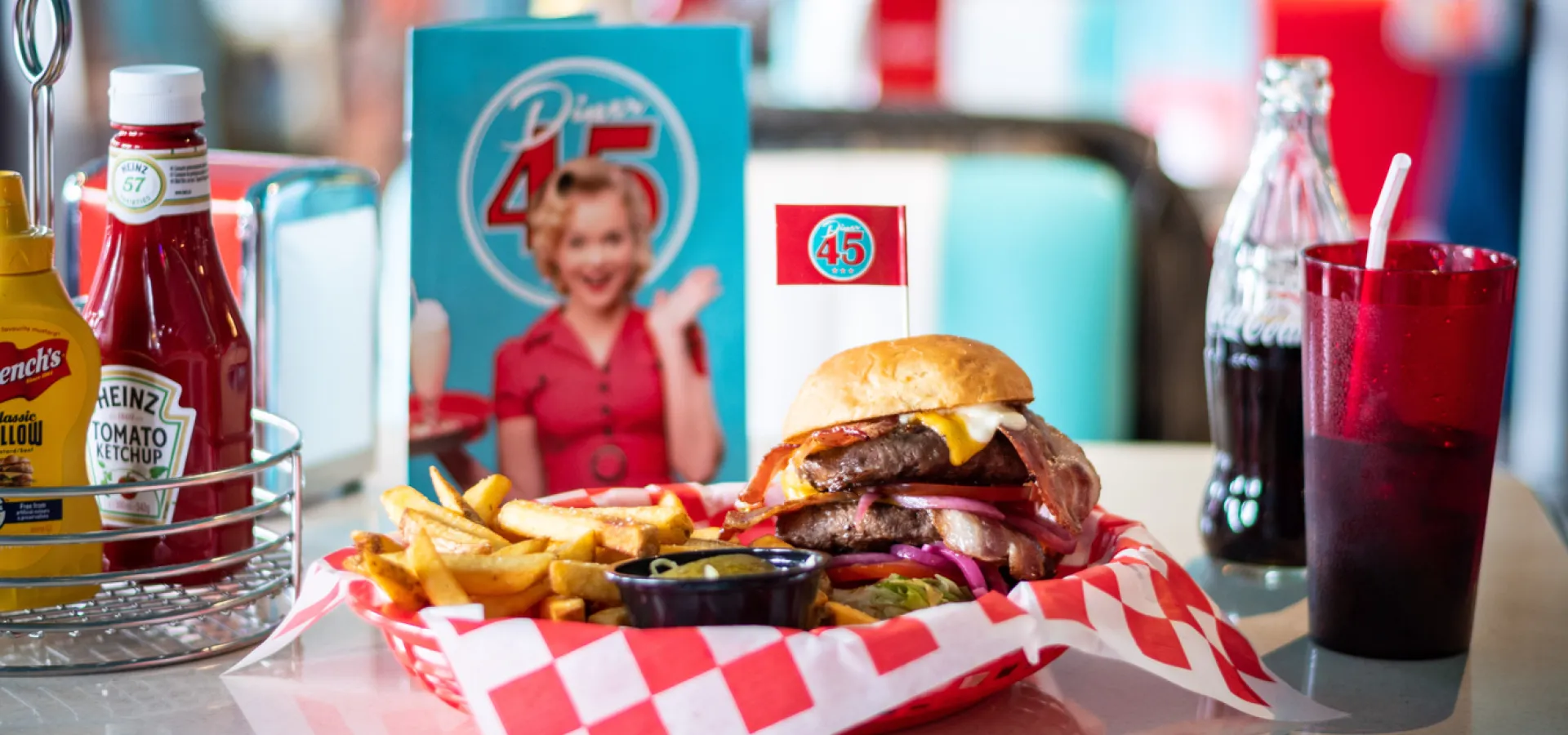 Äntligen middagsdags och självklart ska dagen toppas med en rejäl middag, även den i sann nostalgisk anda. Diner 45 i centrala Rättvik är ett klassiskt 50-talsdiner som serverar burgare, ribs, pulled pork och fantasifullt maffiga milkshakes – allt lagat från grunden med bästa råvaror. Såväl menyn som inredningen är inspirerad av Amerika och enligt ägarna själva är allt tillrett med kärlek och en gnutta chili.