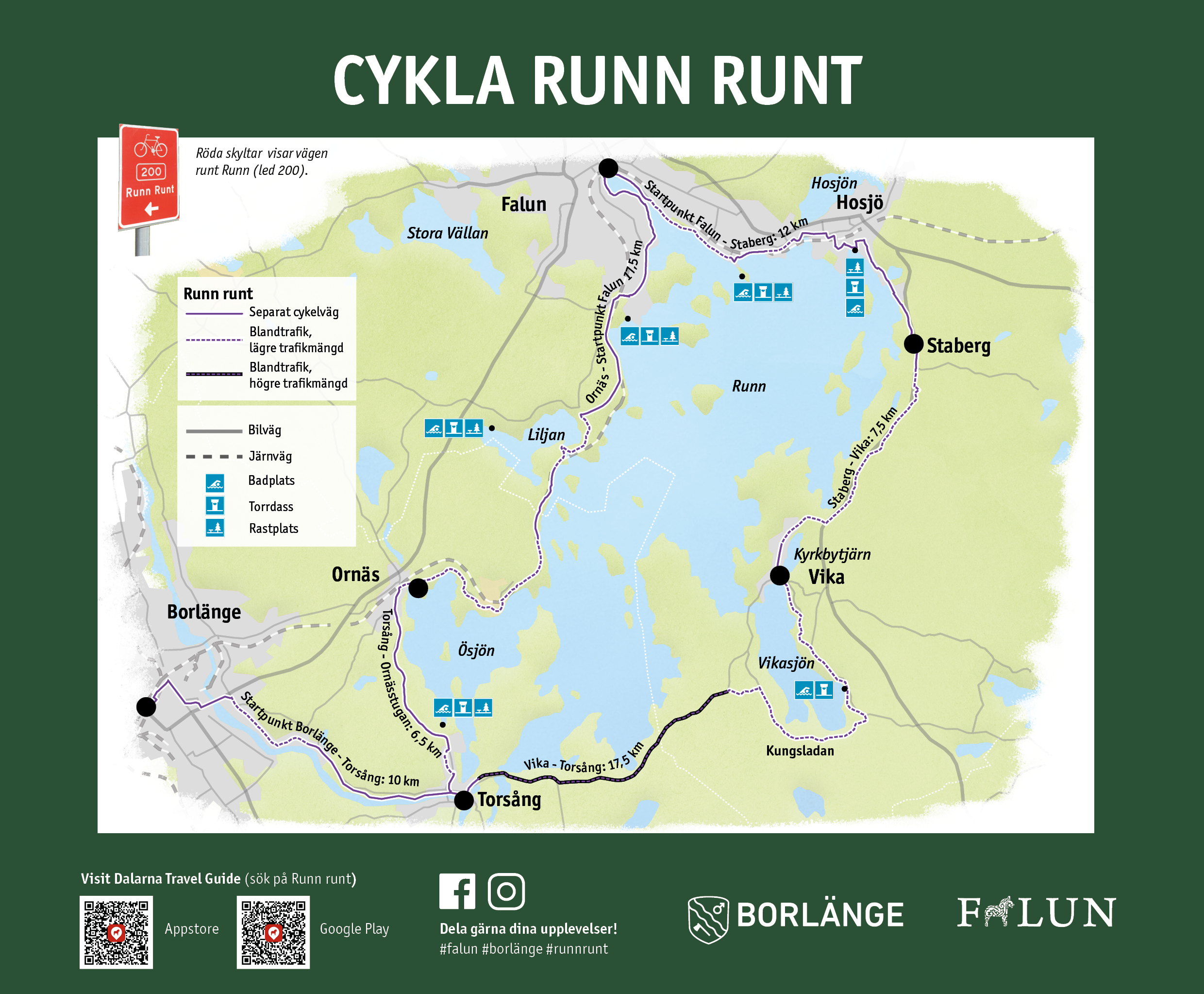 Cykla runt sjön Runn mellan Falun och Borlänge, i natursköna trakter med både sjöutsikt och skärgårdsliknande känsla. Här väntar njutbar cykling längs Sveriges första regionala cykelled. Dessutom finns ett fint utbud av trevliga restauranger och kaféer, badplatser och annat spännande att se och göra.