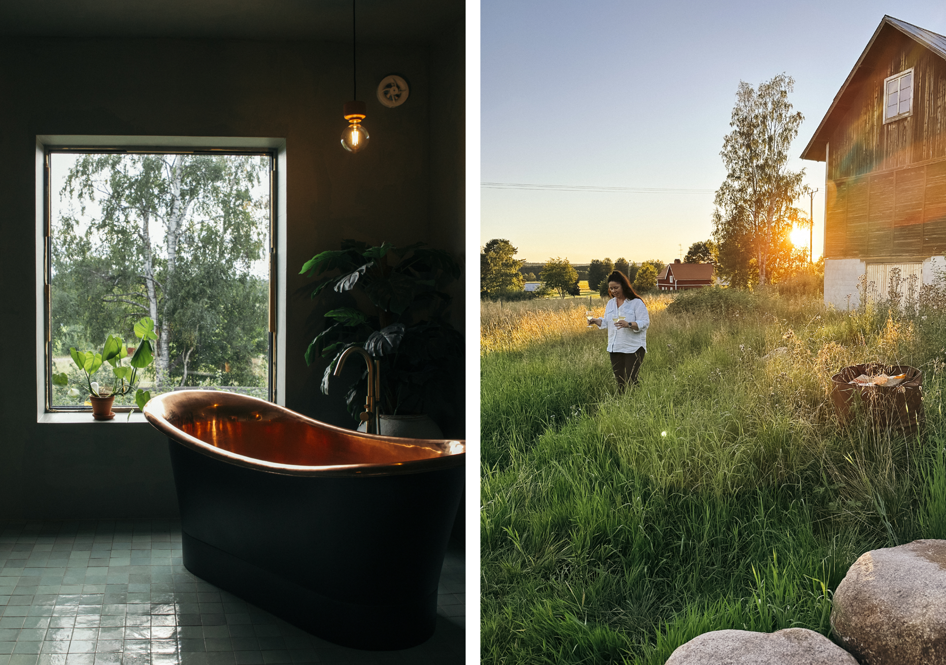 Planlösningen är öppen och luftig och det finns två sovrum och två sovloft. I det generösa badrummet råder bad med vy i det vackra kopparkaret, som ger skogsbad en ny mening.