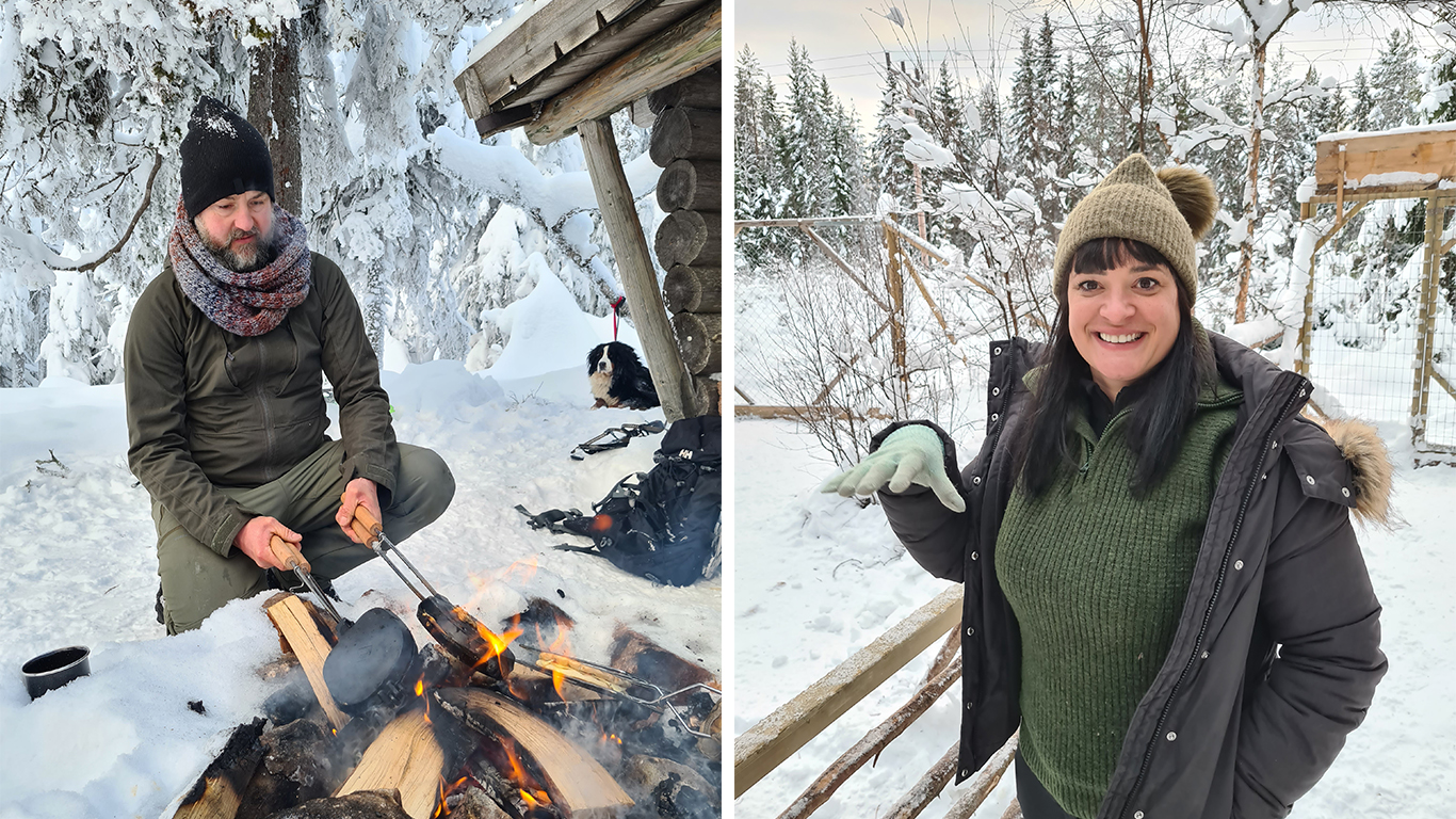 – Efter lördagens frukost, då vi bekantat oss med alla djur som bor på samma gård – gris, får, getter, höns, ankor, kaniner, hundar – for vi till Enviken utanför Falun. Där skulle vi åka hundsläde på Below Zero Husky Tours. På en camp i en skogsglänta väntade ett tjugotal trevliga hundar av rasen siberian husky på att få ta med oss ut på en slinga som gick genom skogen och över en tjärn. Full fart framåt! Vi tre i familjen satt tillsammans i en och samma släde vilket förhöjde upplevelsen. Efter slädturen bjöd Evi från The Mangévie in oss i en liten timmerstuga där vi serverades soppa och belgiska praliner vid värmande eld.