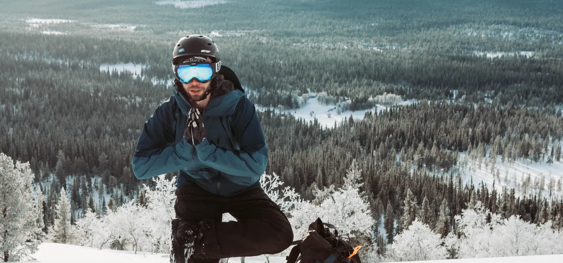 – Den är tagen på toppen av en av Grövelfjälls brantaste nedfarter. Vi var tre goda vänner som hade en extra lång lunchrast och bestämde oss för att ta några åk i den ännu opistade nedfarten. Solen sken, det var 15 grader kallt och ingen vind alls. Tyst och kallt, men framförallt så äkta och så vackert. Det enda som hördes var tunga andetag efter den relativt hurtiga klättringen upp i backen och ljudet utav knarrande snö under våra skidor. På toppen stannar vi till och hämtar andan. Inget sägs, men när vi vänder oss om och kikar ner längs fjällsidan ser vi den underbart vackra utsikten. Rent spontant börjar Johan posera framför det vidsträckta landskapet och jag lyckas fånga en av hans grymma poser! Det är i sådana stunder man är nöjd att kameran är med. Det fina med att bo och jobba i fjällen är dessutom att dagar som dessa återkommer, dagar då en ger sig ut på skidorna i solskenet och i den fina snön.
