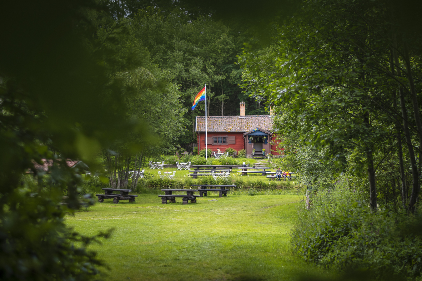 Röd stuga med flaggstång framför i Frostbrunnsdalens naturreservat i Borlänge.