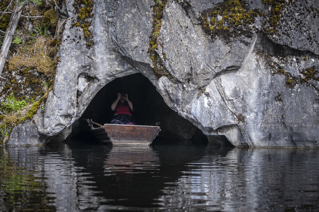 Person sitter i roddbåt i grottan vid sjön Jätturn.