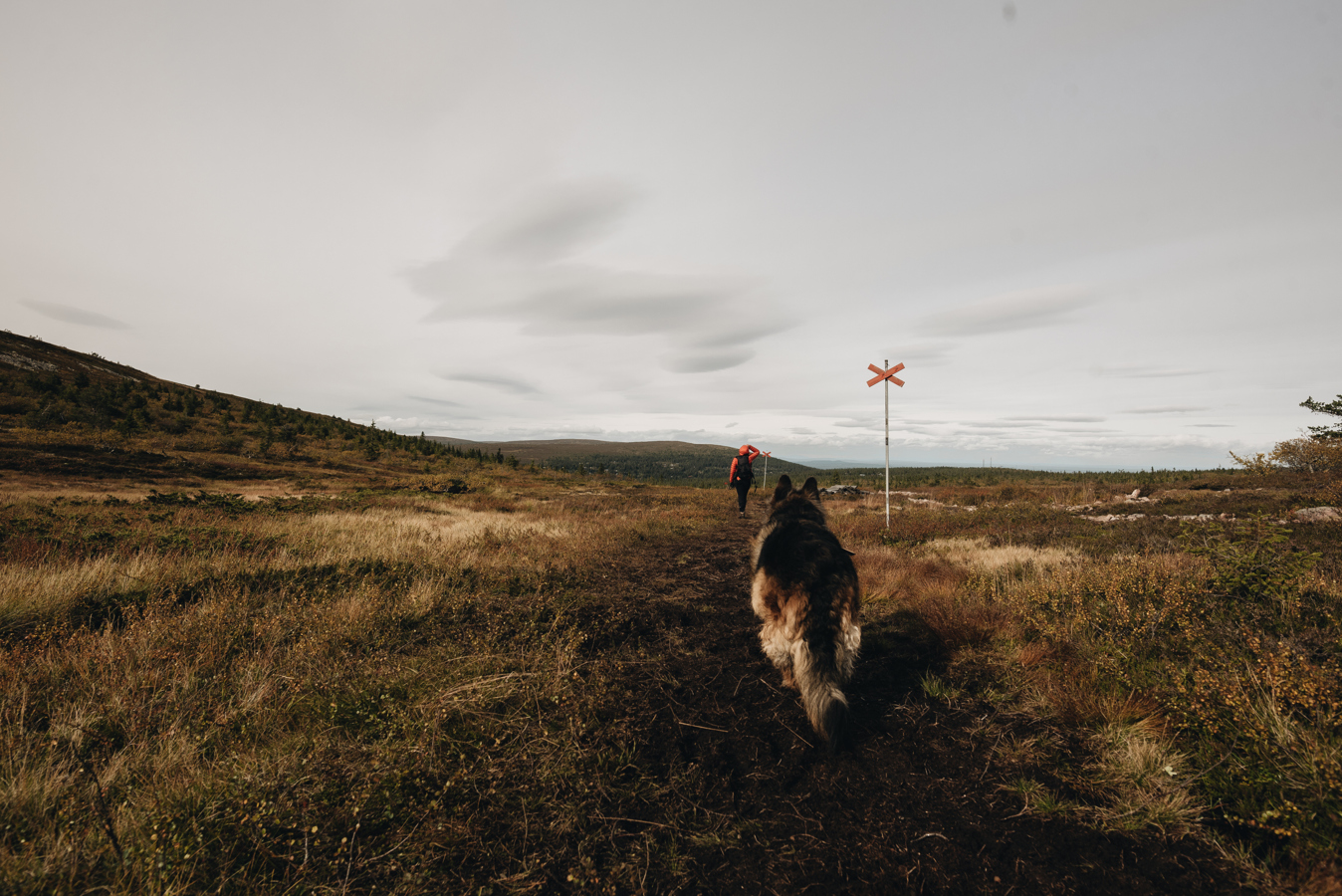 Vandrare med hund på fjället i Idre, med toppen av Städjan i bakgrunden.