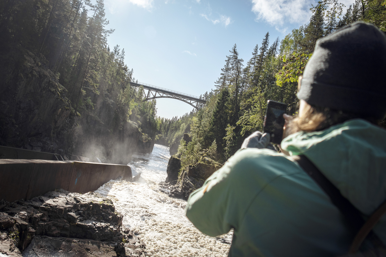 Person tar mobilbild på järnvägsbron vid Storstupet utanför Orsa.