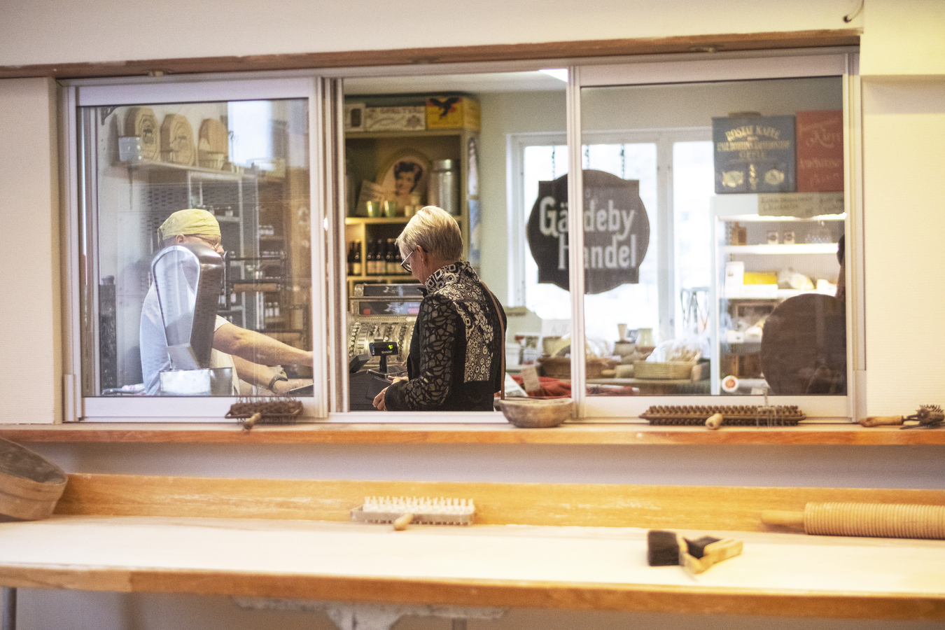 Inne i den gamla fabrikslokalen möts du av den välfyllda saluhallen. I den manuella disken finns färskt kött, goda skinkor, korvar, ostar och delikatesser tillagade i restaurangen. Fläsk- och nötkött, potatis, ägg och mjölk levereras från lokala bönder och producenter. Men det tar inte slut där. Allehanda godsaker finns i hyllorna tillsammans med fabriksförsäljningen av knäckebrödet som bakas på plats i bageriet.