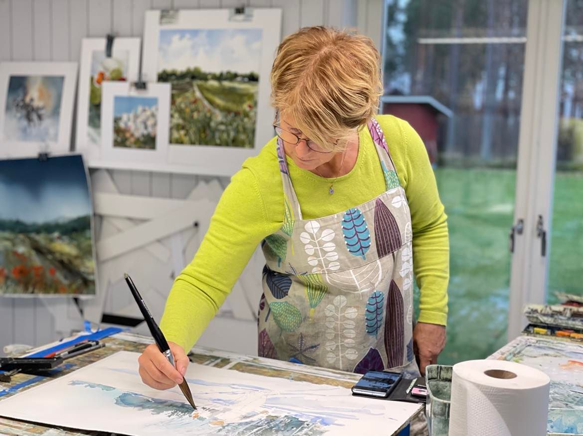 – Jag är från Mora från början, men när vi under en period bodde i norra Sverige hade jag mycket fritid och gick då en akvarellkurs. Det var både superkul och frustrerande och jag kände att det här måste jag jobba med för att förstå mig på. Jag var 26 då, men släppte det aldrig och ju större mina barn blev desto mer kunde jag ägna mig åt måleriet. Vi flyttade tillbaka till Mora och jag funderade fram och tillbaka kring om jag skulle satsa på måleriet mer seriöst. Jag fick mycket uppmuntran och det blev det bästa jag kunde göra, 2012–2013 byggde jag en egen ateljé. Jag fick frihet att gå till min egen verkstad, kom med i föreningen Konst runt Siljan och startade mitt eget företag. Idag jobbar jag halvtid som sjuksköterska och heltid med mitt skapande och det funkar toppen, säger Annette.