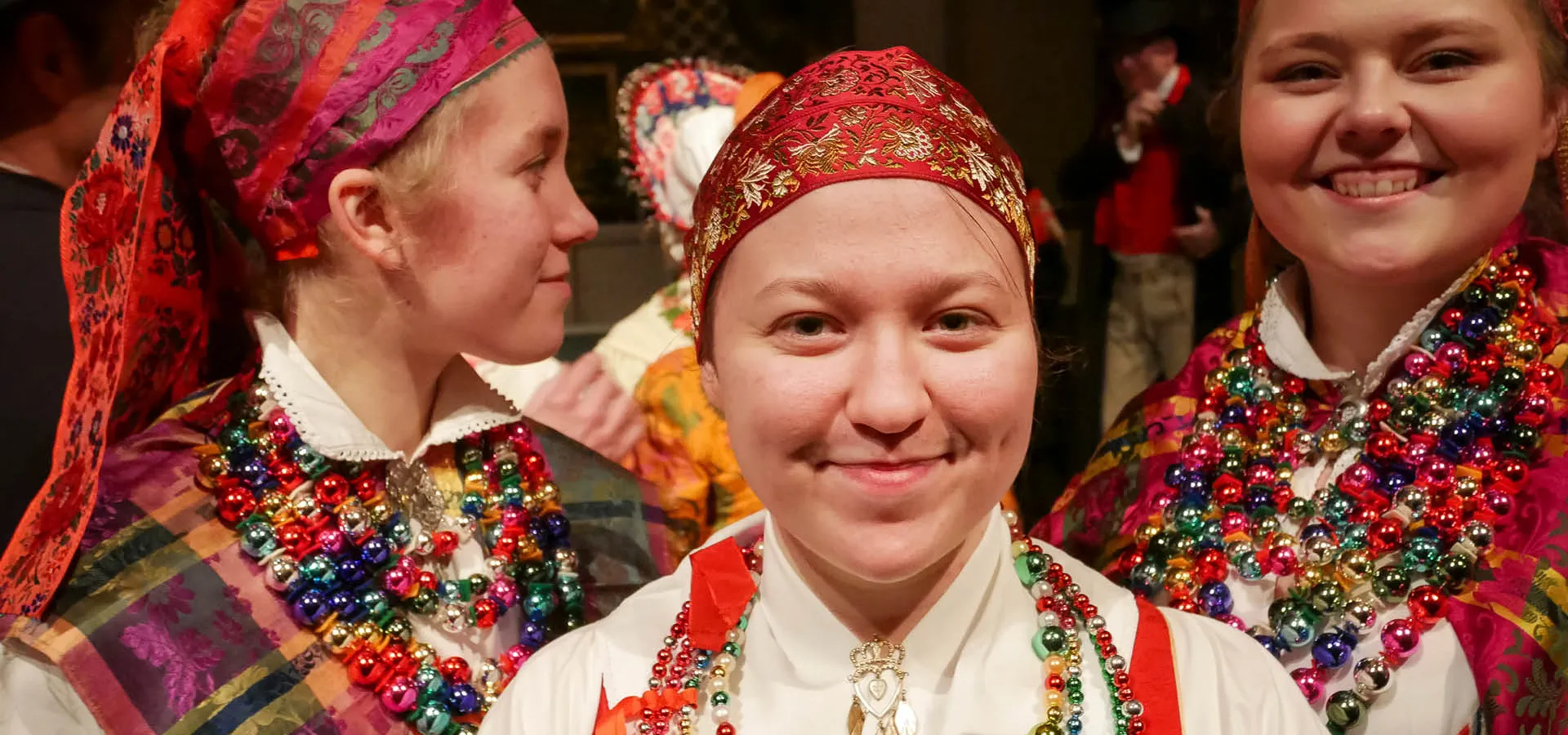 Fram skrider ett spektakulärt luciatåg, så långt från allt vad vita linnen heter. Färgprakten är slående, i de traditionella folkdräkterna som ikväll smyckats ytterligare med pärlor, glitter och band. Den dräktansvariga kvintetten har tolkat de historiska bruddräkterna från Malung, Floda, Mora, Rättvik och Leksand och skapat kreationer som adderar till den finstämda sången.