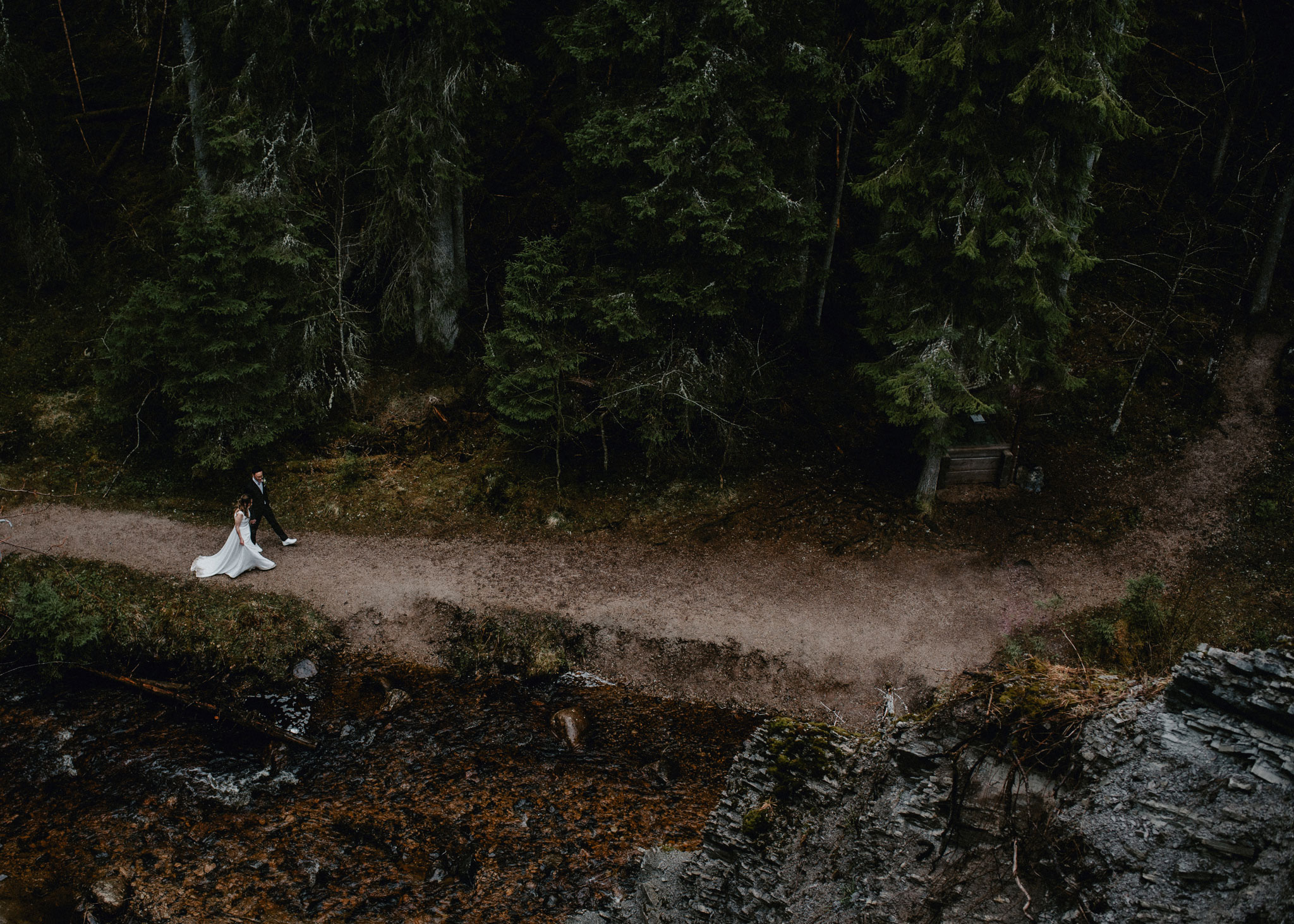 – Mitt favoritfoto är en bröllopsbild som jag fotograferat utanför Rättvik tidigare i våras. Jag älskar kontrasterna i bilden. Deras vackra bröllopskläder mot regnet, det mjuka fallet i hennes klänning mot den hårda steniga stigen och kärleksparet mot miljön runt omkring med höga träd i den djupa bergsskrevan.