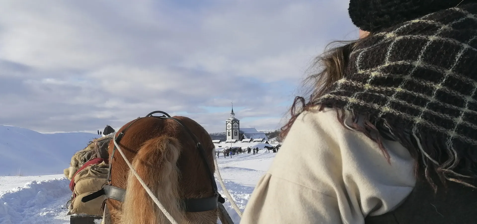 Det ser ut som ett porträtt från förr. En strävsam häst som pulsar genom snön och drar en släde bakom sig. Snön yr och en blek sol kikar försiktigt fram bakom molnen. Människorna i släden är klädda i traditionella kläder, tillverkade av vadmal och ull. Många lager så att de inte ska frysa. Renskinnen värmer rumporna och vinden biter i kinderna. Men porträttet är inte gammalt, utan taget på sjön Femunden i Norge 2023.