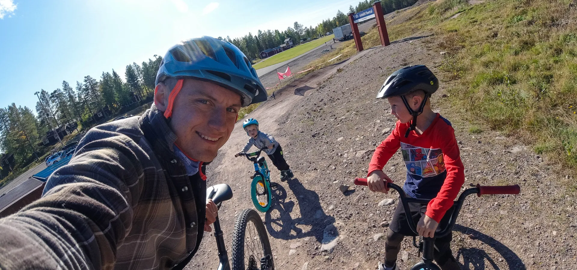 – Ja, vi lyckades pricka en dag med strålande sensommarvärme för vår dagsutflykt, som gick till Orsa Grönklitt. Vi hade med egna cyklar och cyklade deras bana Flowtrail, som är två lättåkta kilometer lång och perfekt för barn. Båda barnen – Sam, 3,5 år och Frank 6,5 år – cyklar mycket, så vi upplevde att det funkade jättebra. Barnen efterfrågade dessutom flera flowtrails! Själva trailen är väldigt lättrullad och fin att cykla på, så det behövs ingen särskild mountainbike tycker jag. De körde på sina små BMX-cyklar.