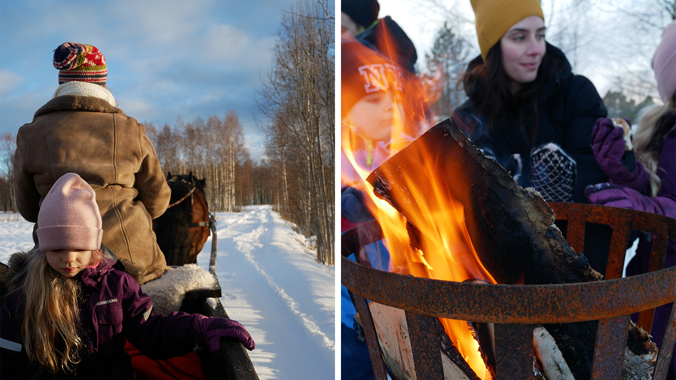 – Ja, när vi kom tillbaka till gården och stallet bjöds det varm choklad och kanelbullar framför en varm eld. Det var riktigt skönt att få tina upp tår och fingrar, plus att elden ger väldigt hög mysighetsfaktor. Barnen fortsatte att titta på hästarna och fick dessutom chans att ge Kuling varsin morot som tack för turen.