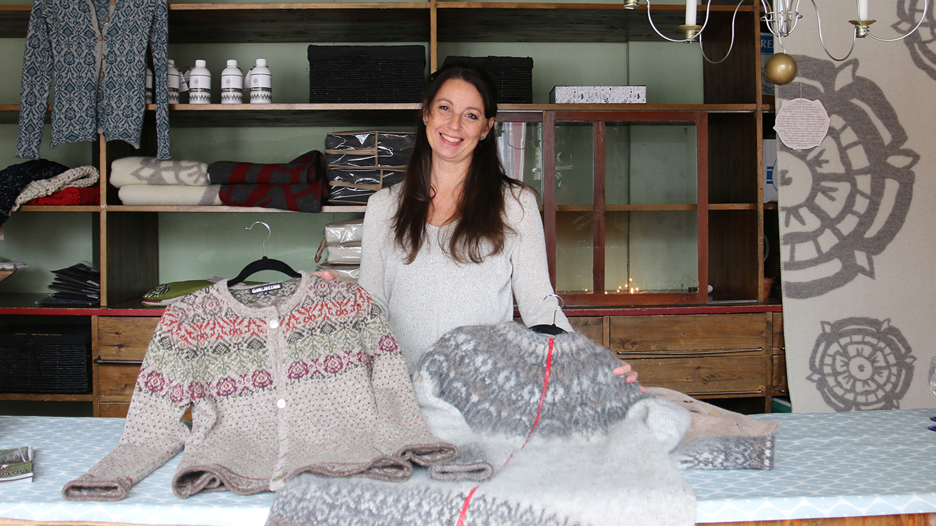 I butiken, som öppnade för ett år sedan, säljs förutom den egna kollektionen och garn även egendesignade filtar i ull som vävs i Röros, Norge. Mönstret i filten påminner om en ros och som med allt annat Anki skapar finns det en historia bakom.