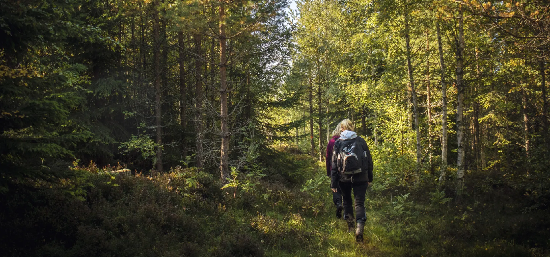 Solen värmde våra ryggar när vi tog våra första steg på den 4 km långa rundan. Vägen smalnade snabbt av till en snårig skogsstig kantad av gran, tall och ormbunkar. Marken var våt och vi var glada över att vi hade rejäla kängor på fötterna. Leden var tydligt markerad och lätt att följa men många spångar hade sett sina bästa dagar.