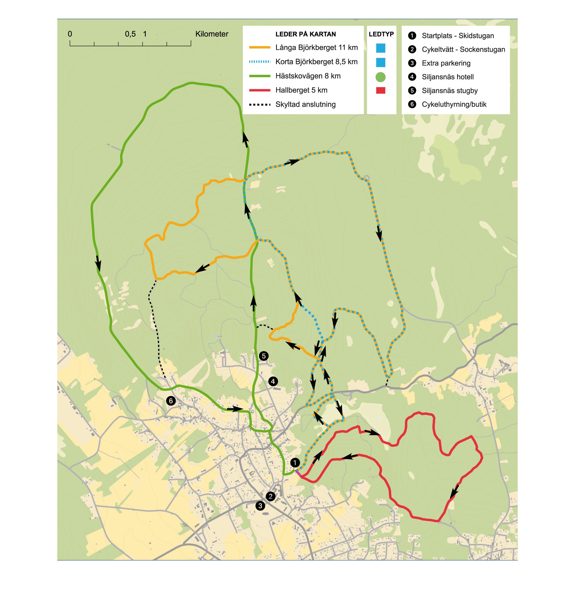 Startplats för cykelleder: Start och mål för samtliga slingor är Siljansnäs Skid- och löparklubbstuga, cirka 300 meter från kyrkan mitt i byn
