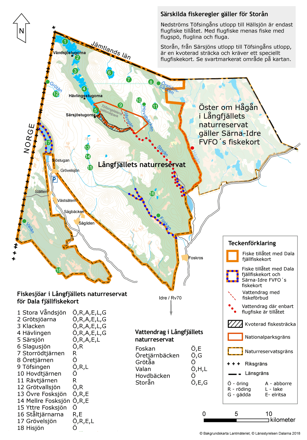I Storån, Långfjällets naturreservat, är det bara flugfiske som gäller. Alltså fiske med flugspö, fluglina och fluga. Sträckan Särsjöns utlopp till Töfsingåns utlopp är dessutom kvoterad. Antalet fiskare är begränsat till max 20 per dygn. Eftersom Storån ligger i ett naturreservat finns förutom allemansrätten fler regler för besökare.