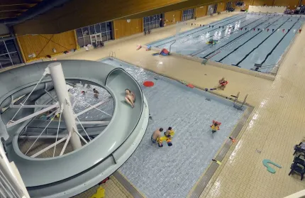 Älvdalen, Ribbholmsvägen 2750 m inomhusbassäng 60 m vattenrutschkana, bubbelpool, solarium, gym, övningsbassäng samt barnbassäng.